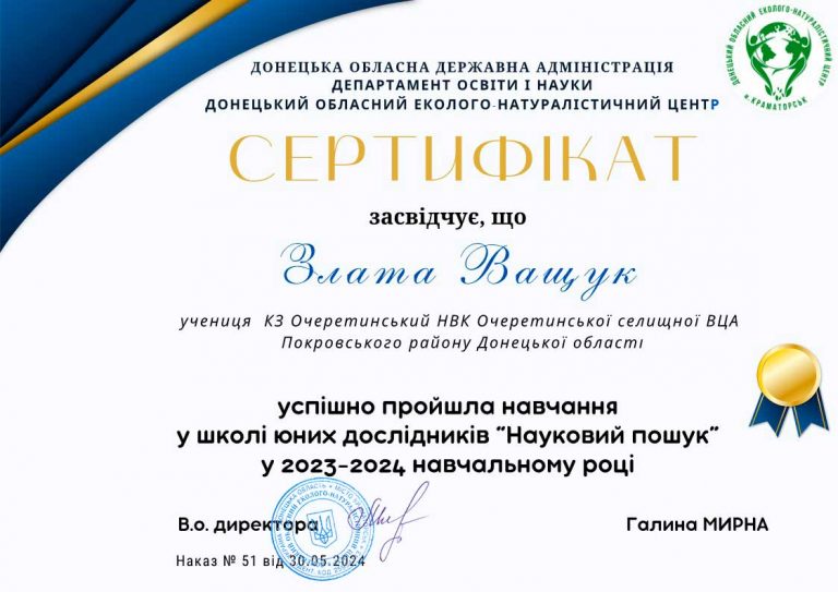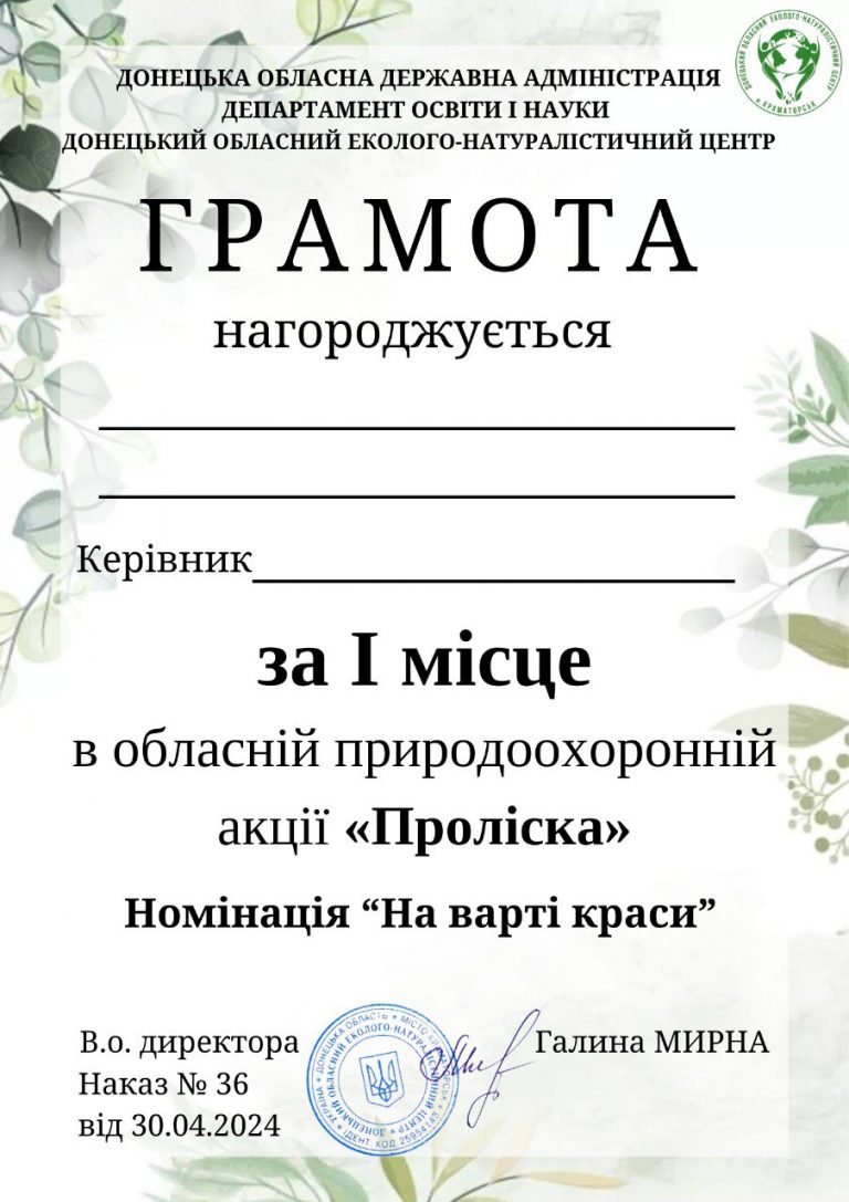 Нагороди Обласний етап Всеукраїнського конкурсу «Новорічна композиція» Грамоти переможців обласного (I) етапу Всеукраїнського конкурсу рукописів навчальної літератури та віртуальних освітніх ресурсів «Нове позашкілля» Грамоти переможців обласного (I) етапу Всеукраїнського конкурсу методичних моделей закладів ЗЗСО та ПО з національно-патріотичного виховання дітей та молоді “Виховати особисті” Грамоти переможців обласного (I) етапу щорічної Всеукраїнської виставки видавничої продукції з позашкільної освіти (Заочні педагогічні читання «Позашкільна педагогіка») Сертифікати учасників фоточеленджу “Герої поруч” Грамоти переможців і призерів, сертифікати учасників, подяки керівникам обласного конкурсу «Екологічними стежками Донеччини» Грамоти переможців та призерів, шаблони сертифікатів учасників обласної виставки фоторобіт юних фотоаматорів «Моя країна – Україна» Сертифікати учасників фоточеленджу «Мій улюбленець, але не…» Сертифікати учасників фотопроєкту «Ми – вільні» до Дня Гідності та Свободи Грамоти, сертифікати обласного етапу Всеукраїнського конкурсу проєктів озеленення “Культура домівки” Грамоти, сертифікати та подяки керівникам обласногосімейного конкурсу «Альтернативні джерела енергії місцевий «чистий» енергоресурс нашої родини» Грамоти, сертифікати, подяки обласного етапу Всеукраїнської дитячо-юнацької екологопатріотичної гри «Паросток» (дистанційний формат) Грамоти та сертифікати обласного конкурсу календарних хліборобських обрядів “Коло Сварога” Грамоти та сертифікати учасникам обласного конкурс юних майстрів народних ремесел «Природа і творчість” Грамоти переможців та призерів, сертифікати учасників направлено на особисті електронні пошти (тел. відповідальної особи 0509338107 – Тетяна Нестерова) Сертифікати учасників челенджу до Дня української писемності та мови Обласний семінар для відповідальних за еколого-натуралістичну роботу та педагогічних працівників, які працюють за відповідним напрямом діяльності в територіальних громадах Донецької області Сертифікати учасникам челенджу до Українського кліматичного тижня Сертифікати учасникам виставки «Мова кольорів в природі» Обласний етапВсеукраїнського конкурсу«Птах року 2025 – Крутиголовка» Сертифікати учасників акції до Дня захисту тварин Сертифікати учасникам виставки «Виготовлення квіткових композицій та патріотичного смайлу» до Дня захисників і захисниць України та до Дня українського козацтва Подяка учасникам Всесвітнього дня прибирання Сертифікати Живи здОрово Сертифікати учасників челенджу “Еко-обіцянка нового навчального року” Сертифікат учасників онлайн-челенджу «Щаслива родина в незалежній країні» Сертифікати учасників патріотичного квесту “Синьо-жовтий колір свободи” до Дня Державного Прапора України Обласни екологічна експедиція-2025 (дистанційний формат) ІІІ зміна Сертифікати учасників обласного фоточеленджу до Дня молоді II зміна обласної екологічної експедиції Обласна виставка-конкурс пасхальногоаранжування «Благовіст» Обласна екологічна експедиція (І зміна) Академія юних дослідників Сертифікати учасникам флешмобу до Тижня безбарʼєрності Сертифікати учасників кулінарного фестивалю «У стилі вишиванки» Регіональний осередок Всеукраїнської дитячої спілки«Дитячий екологічни